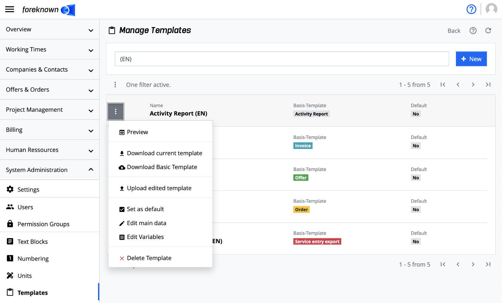 Therefore, the first step on the way to individual activity reports is the creation of one or more templates of the type "Activity Report" in the template management of foreknown.