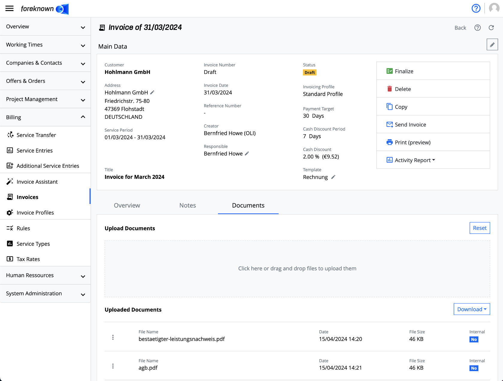 As soon as an invoice is finalized, foreknown also creates the final PDF document with the invoice data.