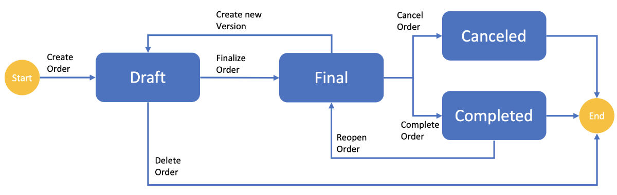 Editing an order is only possible in the "Draft" status. If an order is already in "Final" status, you must first create a new draft version via the "Versions" tab using the "Create version" action.