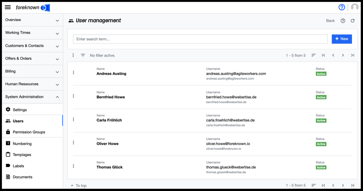 The user administration provides all functions to control the login and permissions of users in foreknown. Therefore, a user must be created for each person who is to be granted access for foreknown and provided with the necessary properties and roles.